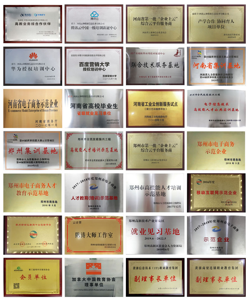 云和数据成立8年,获得了教育部第一批产学合作协同育人项目单位、河南省电子商务示范企业、河南省第一批产教融合型入库培育企业、郑州市电子信息技术高技能人才公共实训基地、郑州市服务外包人才培训机构、第三届郑州市版权协会会员单位、第46届世界技能大赛(云计算方向)省、市两级集训基地、郑州高技能人才培养示范基地、郑州电子商务人才教育示范基地等数十项殊荣。
