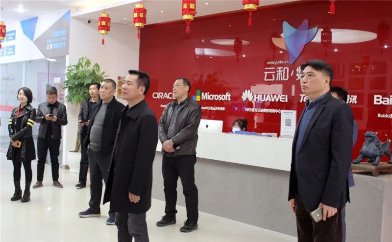 云和数据集团董事长郭总,云和数据集团副总经理伦总,云和数据集团副总经理李总,云和技术事业部副总经理李总,云和技术事业部副总经理牛总,集团互联网运营中心总监杨总,集团人资行政中心总监韩总陪同参观。