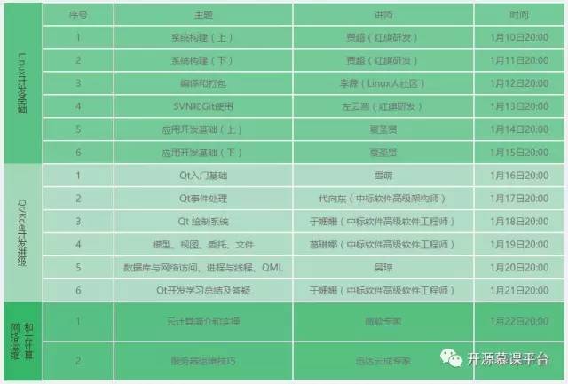 本次线上集训活动授课老师主要来自红旗软件、中标软件研发中心的专家,同时力邀吴琼、夏圣贤等重量级嘉宾讲师加盟。