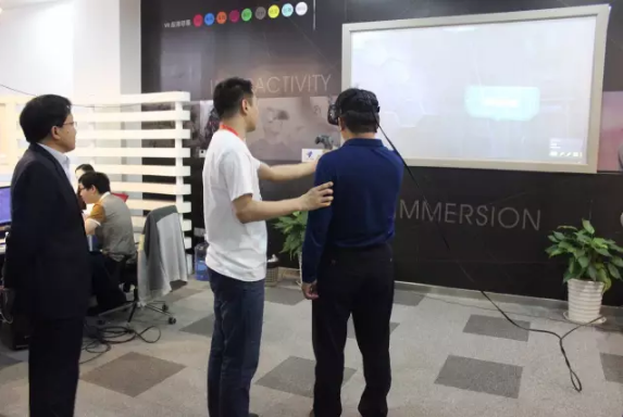 最后薛老师陪同领导们来到云和技术研发中心。在云和数据VR研发中心,各位领导在工作人员的帮助下体验了虚拟试衣间和瓷器工坊项目以及VR游戏,并对身临其境的代入感与科技感表示惊叹。